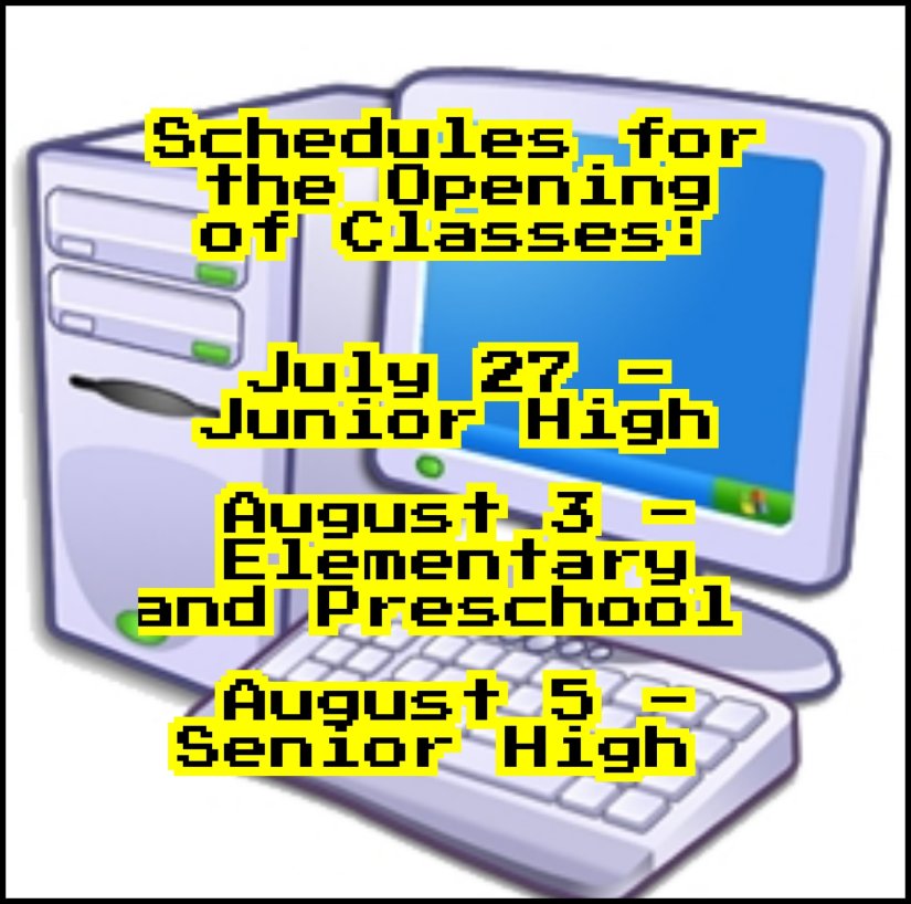 Back To School 8 Jul 20209 Jul 2020 Admin 2020-07-27T14:19:00 days hours minutes secondsuntilOpening of Junior High School Classes 2020-08-03T14:20:00 days hours minutes secondsuntilOpening of Preschool and Elementary 2020-08-05T14:27:00 days hours minutes secondsuntilOpening of SHS Share this: Click to share on X (Opens in new window) X Click to share on Facebook (Opens in new window) Facebook Like Loading... Related
